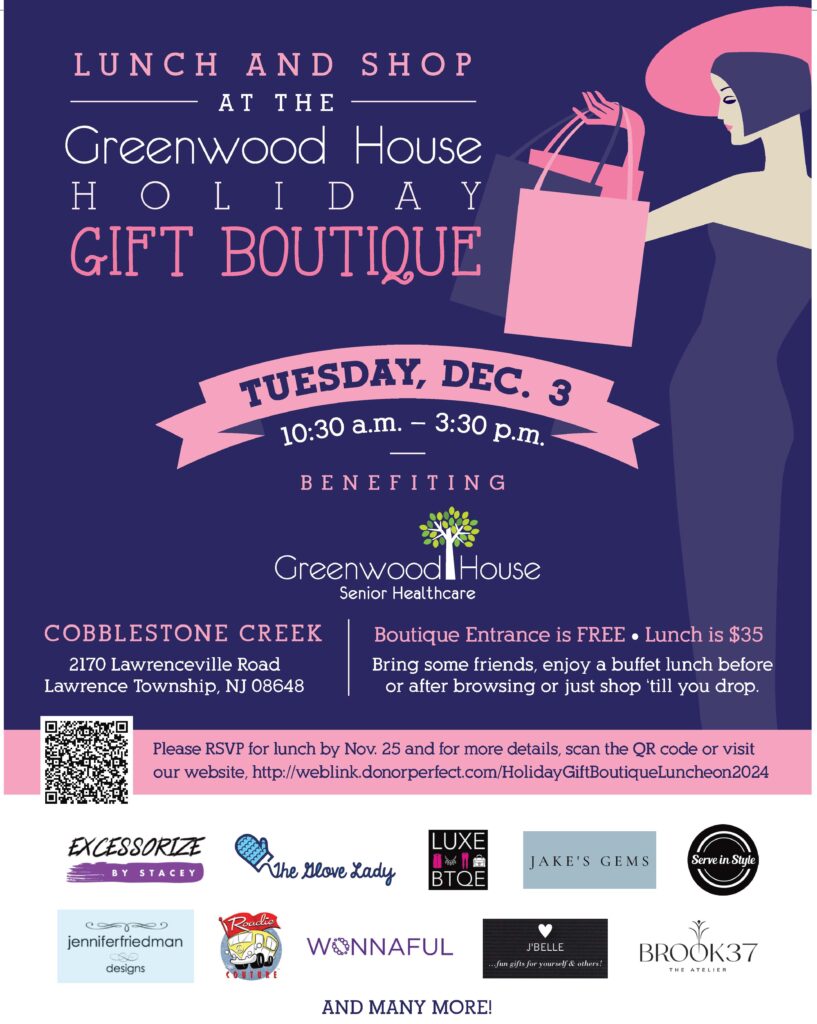 Please join us on Tuesday, December 3rd, 2024 for Lunch and Shop at the Greenwood House Holiday Gift Boutique at Cobblestone Creek Country Club.The boutique entrance is free. Lunch is $35 and requires registration.